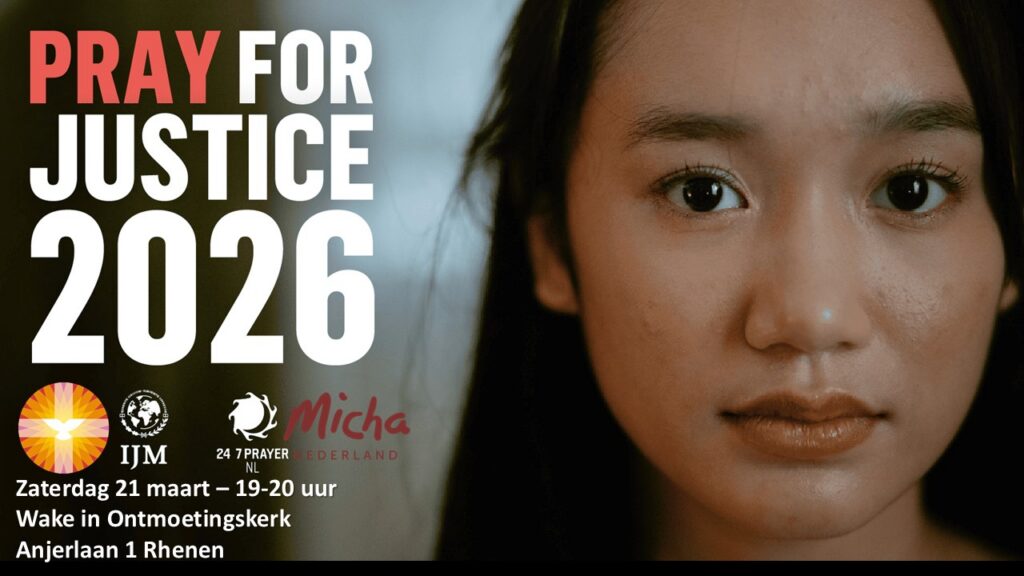 Pray for Justice is een wereldwijd gebedsinitiatief in maart 2026. International Justice Mission (IJM) en 24-7 Prayer NL organiseren dit samen met kerken over de hele wereld. Ook in Nederland. Samen bidden we dat Gods licht doorbreekt waar onrecht, geweld en uitbuiting levens beschadigen. We bidden voor: bescherming van kinderen; gerechtigheid èn herstel; wijsheid voor opsporing, rechtspraak èn hulpverlening; een duidelijke afname van vraag naar misbruikmateriaal. Ook in Rhenen willen we hieraan bijdragen. Wees welkom mee te bidden op: 21 maart 2026 19-20 uur Ontmoetingskerk.